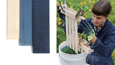 Heide Martin uses a vat-dying technique with its roots in fabric dying to give vibrant indigo color to her furniture.