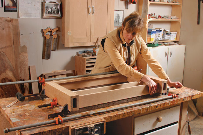 Synopsis: In this video series, learn to make a strong, attractive wall-hung cabinet like this one by Garrett Hack. The smart sliding-dovetail case construction creates a very sturdy cabinet and makes it easy to attach decorative moldings. Hack’s unique design also includes an unorthodox face frame that blends seamlessly into the case. The face frame makes shelf construction is easier since you can run through-dadoes for the shelves. Although best for hanging cabinets, this design works for standing cabinets as well. Also, check out the article version of how to build this cabinet.
