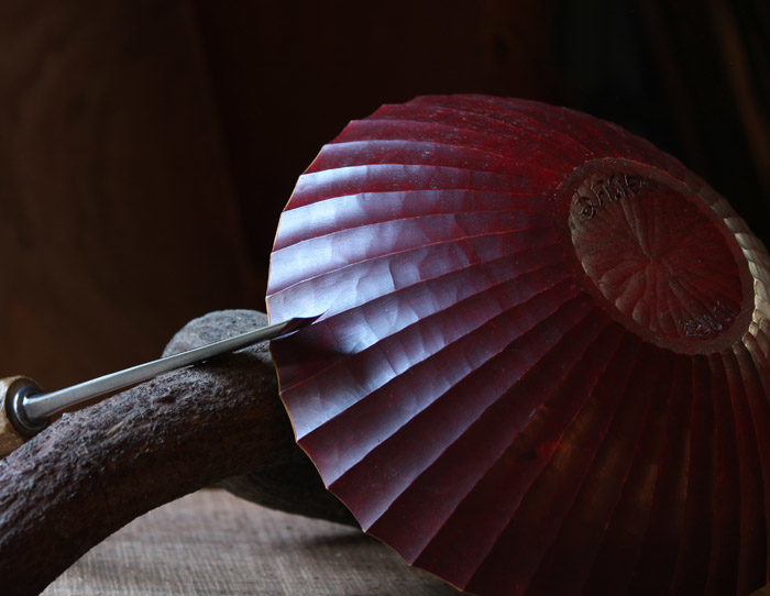 The article explains in detail how to carve the fluted pattern. For this fluted bowl in maple, I added color to the exterior with artist’s oil paint. These paints are in convenient tubes and are simply a mixture of linseed oil and pigment. Squeeze out an inch or so into a dish and add a few drops of linseed oil. Diluting the paint like this (you can also add a bit of citrus thinner) increases transparency, allowing the grain of the wood to show through. To what extent is up to you. Depending on the color, it can take days for the paint to cure, which gives you time to carve some other bowls while you’re waiting. Of course, milk paint, acrylics, and all sorts of options allow you to experiment with color.