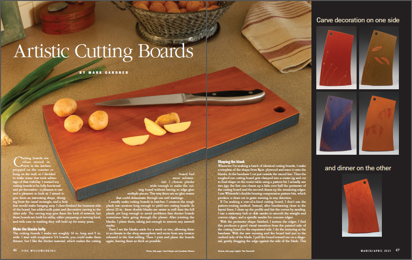 Cutting boards are often stored in view in the kitchen, propped on the counter or hung on the wall, so I decided to make some that took advantage of that visibility. I wanted my cutting boards to be fully functional and yet decorative—a pleasure to use and a pleasure to look at. I aimed to give them an interesting shape, diverging from the usual rectangle, and a hole that would make hanging easy. I clear-finished the business side of the board, but added milk paint and decorative carving to the other side. The carving may give them the look of artwork, but these boards are built for utility, either preparing or serving food, and with care in washing they will hold up for many years.