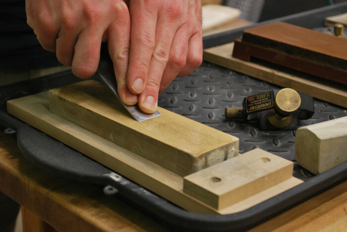 To test yourself, grab a chisel or plane blade that has either a consistent, perfectly flat bevel or one that has been freshly hollow-ground. These will register nicely on the stone and provide better feedback. Rock the tool’s bevel on the stone until it displaces a little of the oil or water you’re using as a lubricant – that little bead of liquid lets you know that your bevel is fully in contact with the stone. Now, do your thing for a few strokes. How does it look? If things are uneven, troubleshoot. Is there a wobble on your forward or back stroke? How’s your posture? Would it help to lock your elbows and move with your hips? Keep checking and making adjustments every 10 passes or so. If you can get the job done, great. If not, try again next week. In the meantime, work on your technique while using your guide. None of this is to suggest you should ditch the honing guide. Instead, it’s a little self-check and a reminder not to fear sharpening the tools the guide can’t hold.