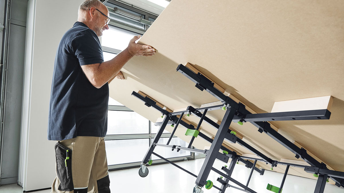 Festool is releasing its STM 1800 Mobile Sawing Table, a knockdown worktable for letting one person load, tip, and align large sheet goods by themselves. The table securely supports sheet goods up to 10 ft. by 7 ft., and it doubles as an assembly bench. It pairs with Festool’s portable track saws and guide rails to create a mobile panel saw station.