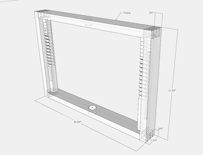 I started at the top of the music stand, the adjustable music racks. I assumed this would be the most difficult portion to develop. Below you can see this first stage of design – sizing up the components, but without any joinery. At this stage, I was ignoring how to do the angle adjustment with ratchet teeth. I knew the Music Holder Side assemblies would be hinged to the top of the rectangular Frame. I also knew the Arms would also be hinged and connected to the Music Holder Sides.