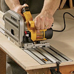 Because your saw is elevated on the plate and track, you lose 1 in. of cutting capacity, leaving a 7-1⁄4-in. saw with about 1-3⁄8 in. of cutting depth. That’s plenty for sheet goods but a potential issue for thick slabs. The minimal instruction sheets packed with the kit are the only other downside. But after I did a bit of digging for info on YouTube, setup was a cinch. The clamps on the saw plate were easy to adjust for my saw, as they will be for most on the market (check the Q&A section of the online product page to be sure your saw is compatible). Once positioned, the clamps lock the saw in the same place every time, so it always lines up with the zero-clearance strip on the track. To locate a cut you simply line up the trimmed edge of the strip with any two layout marks.