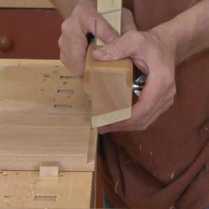 Synopsis: Often used in partitions and to join fixed shelves to cabinet sides, sliding dovetails are a useful joint that can sometimes be frustrating to fit. Chris Gochnour prefers the tapered variety because it is easier to slide in from the back yet still fits tightly at the end of the socket. Learn how to size one and cut it by hand with a dovetail plane.