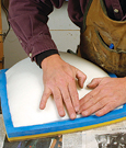 It is important to bevel the inside edge of this outer band to ease the transition between the high-density styrene foam and the medium-density urethane foam that will fill the center. Without the bevel, the change in firmness will be too abrupt.