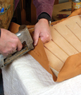 The seat platform should be wrapped with thin, neutral-colored cotton muslin in preparation for the upholstery fabric. The cotton muslin can be stretched lightly with medium effort and stapled to the underside of the platform, followed by the upholstery fabric. A good hand stapler will work, but an air-powered stapler that shoots narrow staples is much easier to use, particularly if you intend to make a lot of upholstered chairs. I use a Haubold stapler with 1/4-in.-long wire staples, which tend to drive in completely, holding the fabric firmly.