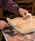 Cut the foam about 3/8 in. bigger than the opening all the way around and leave the edge square — not at a 45° bevel. Spray adhesive on one side of the urethane foam and on its edges. Then spray the center surface of the seat, including the 45° edge but not the remaining top surface. Attach the square-cut edges of the urethane foam to the 45° edges of the band, working in from the corners. The center of the urethane foam will form a bubble. Press down the bubble into the center area in a uniform manner. There may be small bumps around the edges, but these will be evened out in the next step.