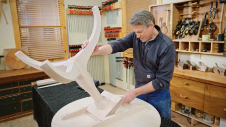 This week on Classic Woodworking, host Tom McLaughlin shares his design for a Shaker-inspired tilt-top table made of curly maple. The table has a pedestal base with a turned column that…