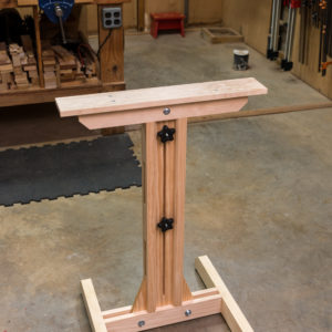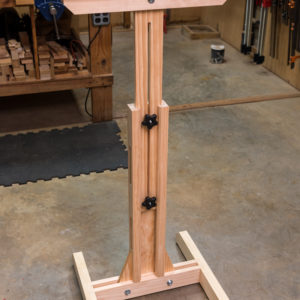 I made this support stand many years ago, and it has proved to be a very helpful friend. The top can be quickly and precisely adjusted from 44 in. high—tall enough for my bandsaw—down to 31 in., so it stores under my tablesaw’s outfeed table.